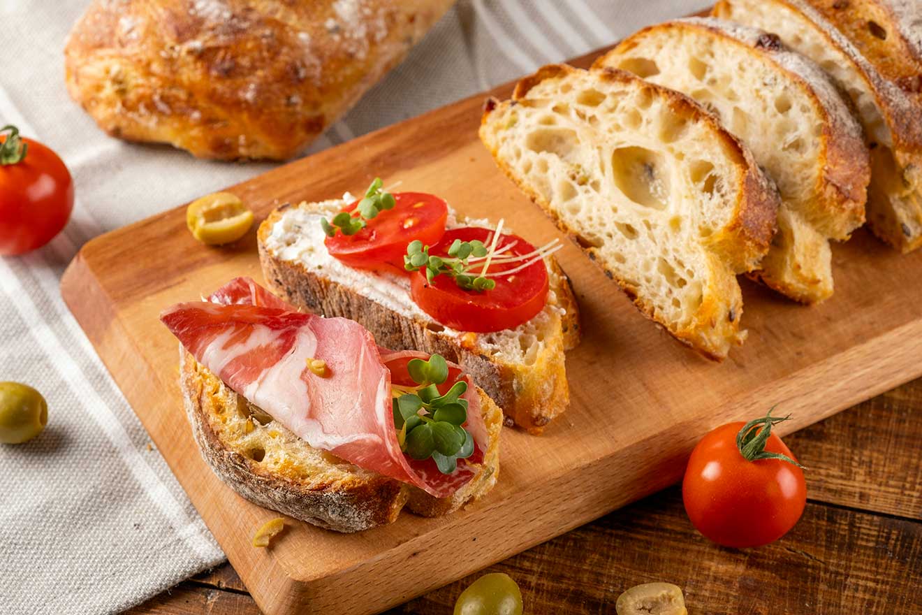 Le pan con tomate est aussi un classique des tapas espagnoles. Il s’agit de de tranches de pain frottées avec de la tomate fraîche et un peu d’ail, assaisonnées avec de l’huile d’olive et une petite pincée de sel.